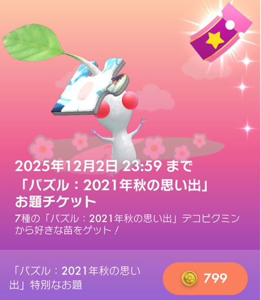 「パズル:2021年秋の思い出」お題チケットはこちら。今回は紫ピクミンが残ってしまった。後1週間あるので何とかゲットしたい。