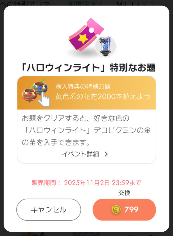 たまたまオンラインイベントに参加してコインを少し多く持っていたので、コインでハロウォンライトの苗を購入してみることにした。正確に言うと「ハロウォンライト」お題チケット。しかし苗1つで799コインとは高い…。